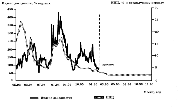 Ретроспективный анализ динамики индекса обобщенной доходности рынка ГКО и темпов прироста реальной денежной массы показывает, что указанная зависимость достаточно четко прослеживается. Об этом можно судить по рис. 4.